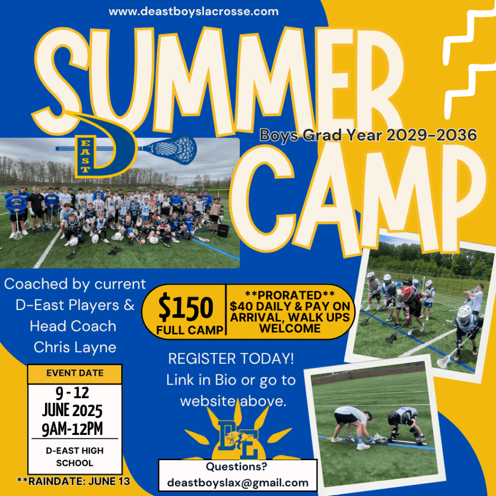 Join us for our Summer Camp! Boys will be coached by our current D-East Lacrosse Staff and Players.